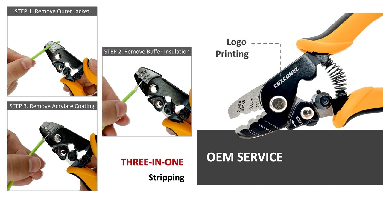 Dieses Faserzangenwerkzeug verfügt über eine klare Markierung zum Abisolieren von drei Durchmessern des Außenmantels. Die ersten 2,0–3,0 mm sind für den Außenmantel des Glasfaserkabels; Zweitens dient das 900-um-Loch der Pufferisolierung und das letzte Loch dient der Acrylatbeschichtung des Glasfaserkabels. Ein weiteres Merkmal dieser Faserspitzzange ist die Griffverriegelung, die eine platzsparende Lagerung ohne Bruch ermöglicht.