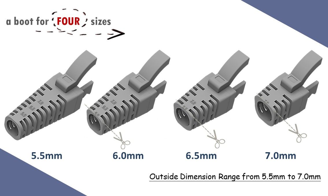 Die einstellbare RJ45-Steckerabdeckung von Crxconec ist für UTP-, STP- und FTP-Stecker geeignet. Der Außendurchmesser reicht von 5,5 mm bis 7,0 mm. Dies ist eine flexible Option zum Messen und Anpassen Ihrer Kabeldurchmesser.