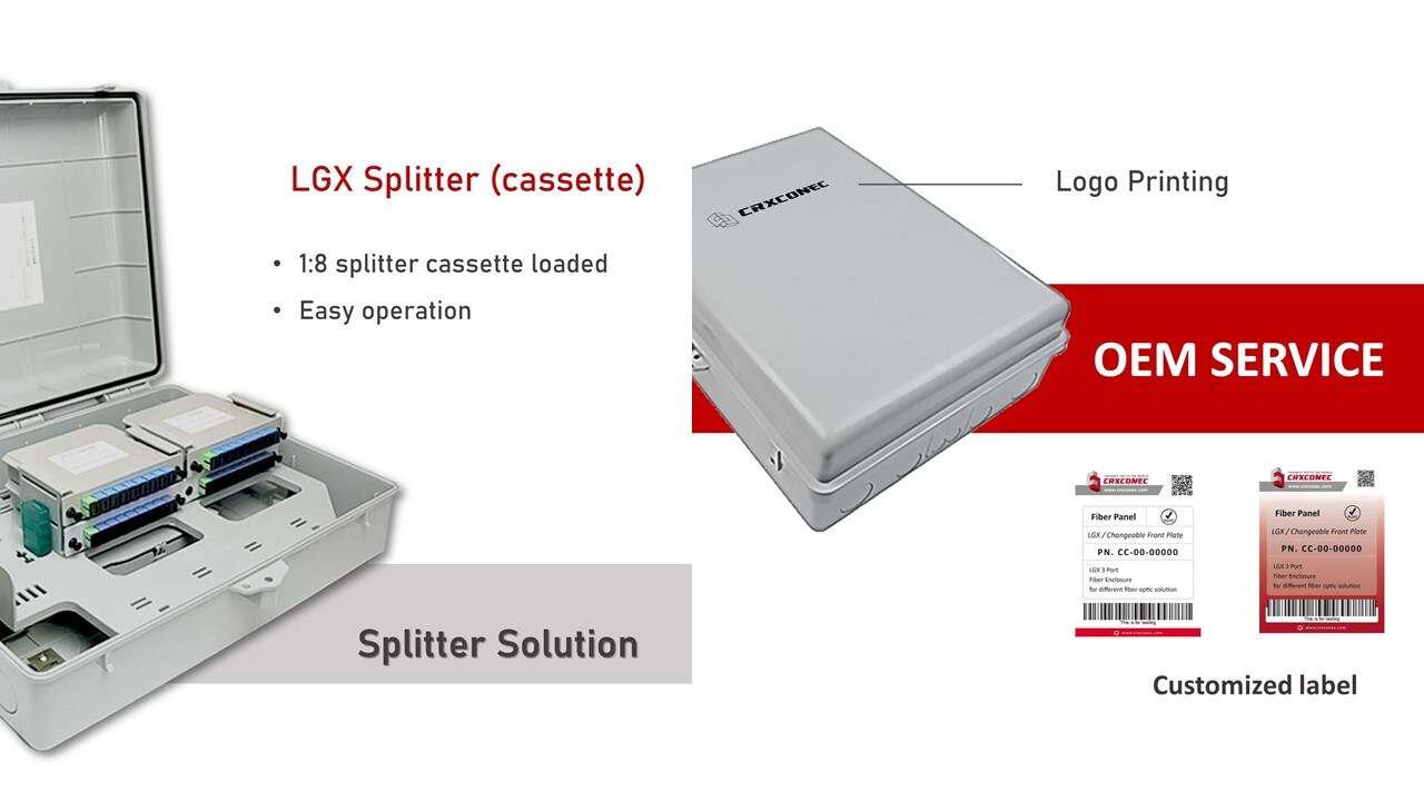 CRXCONEC bietet OEM-Optionen für den Druck Ihres eigenen Mid Spanning 24 Core Fiber Distribution Box-Logos und die Anpassung eines geeigneten Etikettendesigns für den Vertriebskanal.