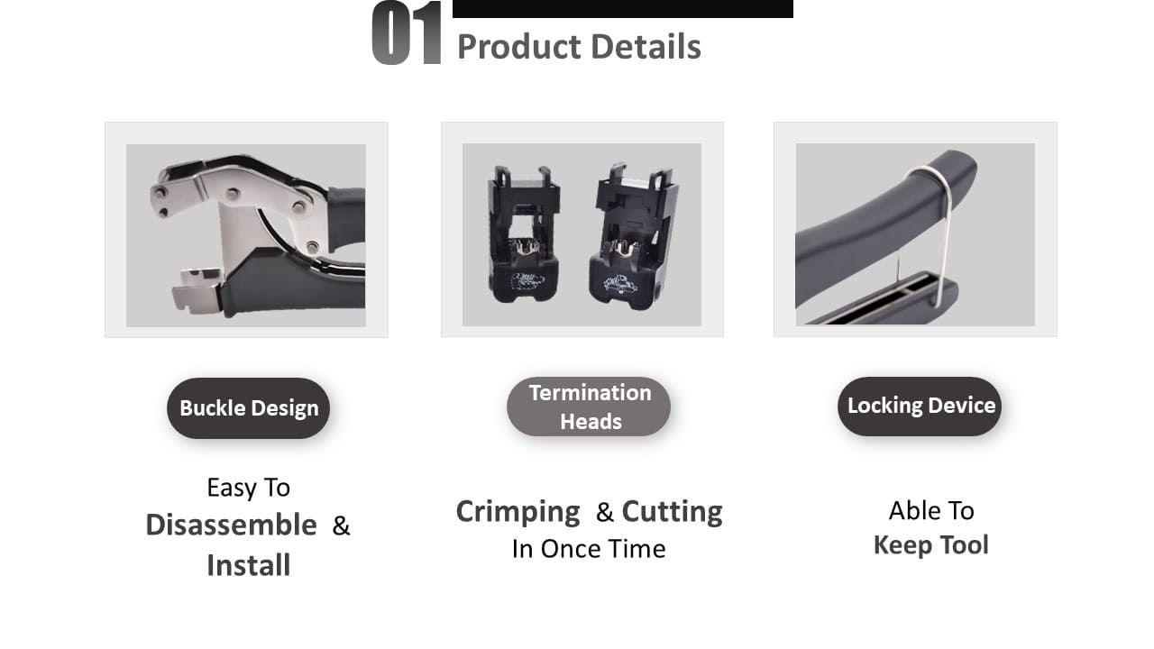 - Reduziert die Installationszeit, benutzerfreundliche Werkzeugsitze und schneidet alle Drähte gleichzeitig ab.
